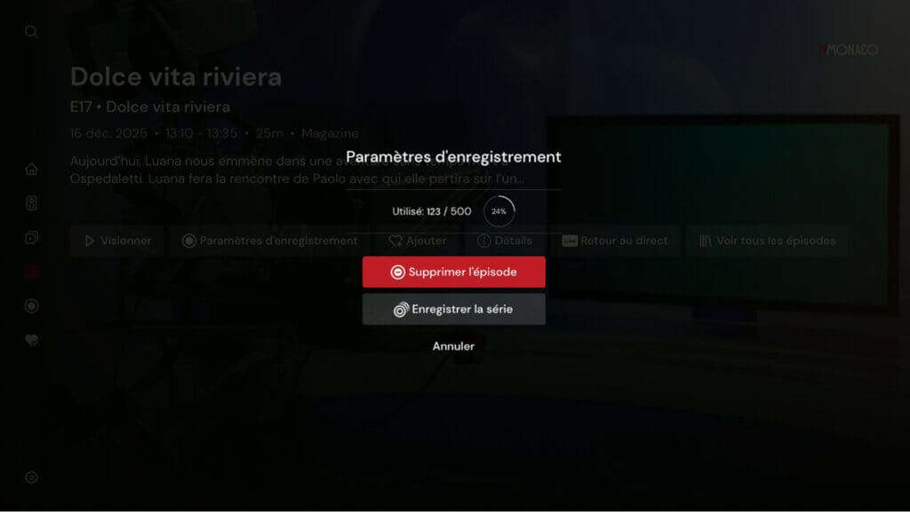 Un écran superposé apparaîtra avec les options disponibles et des informations sur l'espace d'enregistrement utilisé. Vous pouvez choisir d'enregistrer un seul épisode (« Enregistrer l'épisode ») ou une série d'épisodes attribués à une série donnée (« Enregistrer la série »).