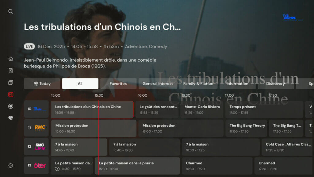 Vous pouvez basculer la vue Programme TV entre « Tous », « Favoris », ou choisir parmi les catégories des chaînes.
