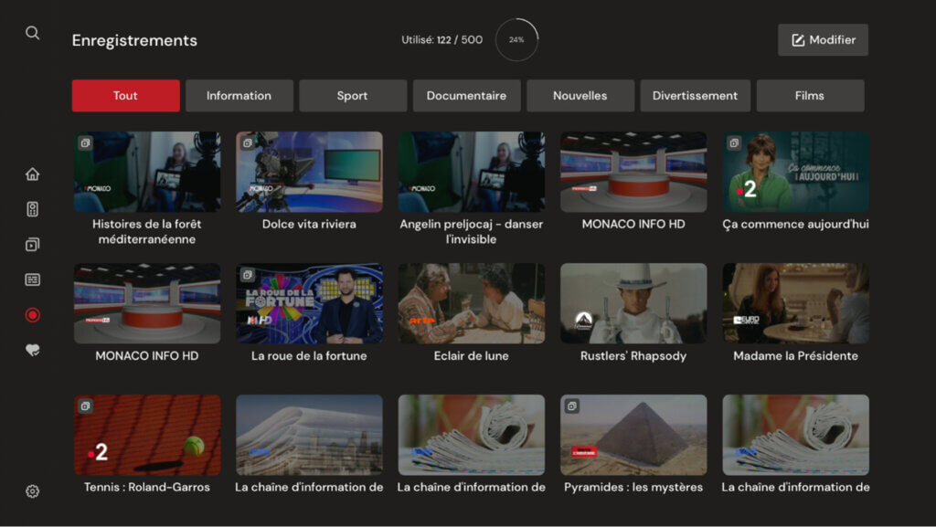 Tous les enregistrements disponibles et programmés sont affichés sur la sous-page « Enregistrements ». Vous pouvez sélectionner une catégorie pour filtrer rapidement les enregistrements disponibles par genre, type ou catégorie.