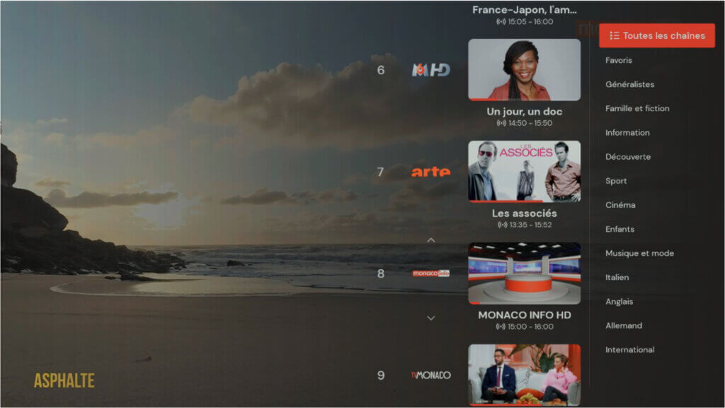 Toutes les chaînes disponibles et les programmes en cours de diffusion sont répertoriés dans une liste verticale sur le côté droit de l'écran. Les programmes en cours sont affichés à côté des logos des chaînes.