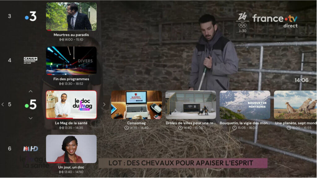 Pour afficher le « Mini guide des programmes » en superposition, swipez sur le bouton gauche « ← » du pavé directionnel de votre télécommande pendant que vous regardez la TV. Pour le fermer, appuyez sur le bouton retour de la télécommande. Remarque : la barre du lecteur doit être masquée pour que cela fonctionne.