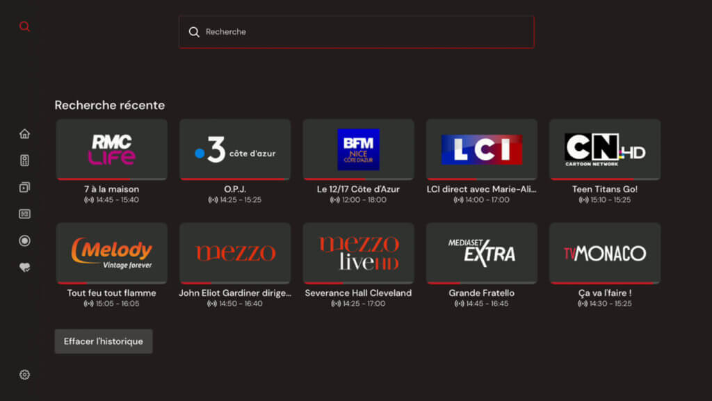 Il répertorie toutes les chaînes disponibles et affiche la programmation disponible sur un axe temporel.