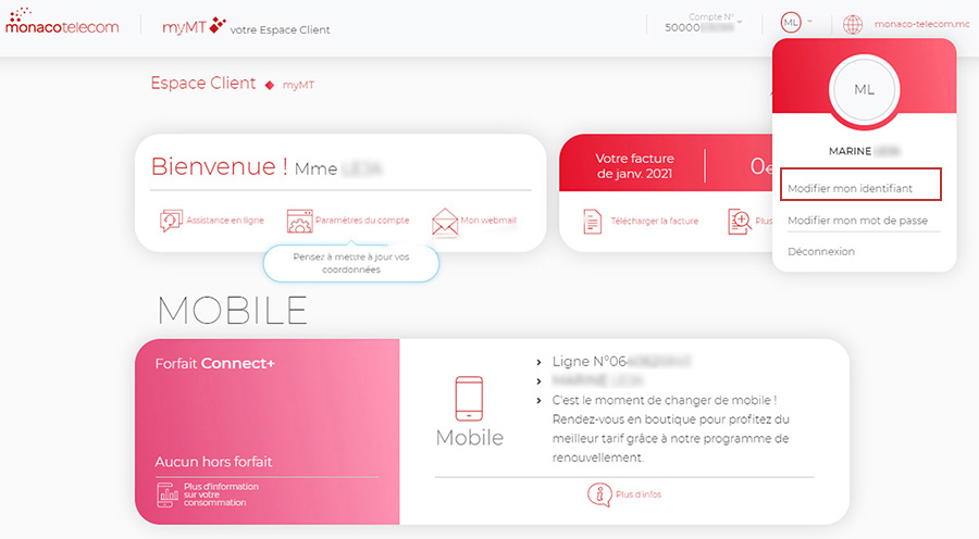 Pour modifier votre identifiant, rendez-vous sur votre espace client myMT.
